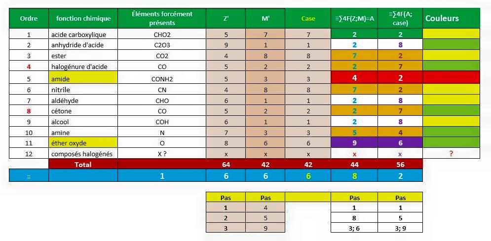 Retenons donc qu’avec les groupements fonctionnels, 1 ; 2 ; 3 donnent priorité à la masse atomique, 4 ; 5 ; 9 au numéro atomique et 6 ; 7 : 8 aux travaux communs. (Cf. Tableau ci-joint). Rappelons que ces groupements fonctionnels définissent, ensemble, l’ordre de priorité des réactions chimiques.