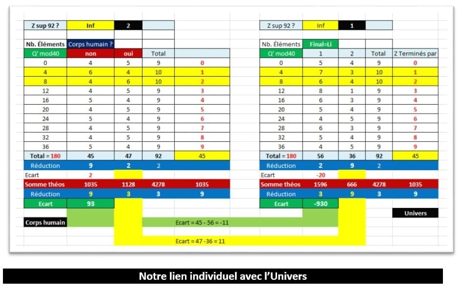 3. LE MOMENT EST VENU POUR CHANGER DE PARADIGME : Par rapport aux médicaments, aux produits phytosanitaires et aux additifs alimentaires c’est le comble ! La nature n’admet pas un élément extérieur ayant plus de 92 électrons dans le corps. Nous le faisons ! Elle ne permet pas un quelconque conflit avec les bases ADN de notre corps. Nous nous en foutons par ignorance ! Quand on sait que c’est une simple différence de 8 électrons qui fait changer radicalement de fonction les bases ADN de notre corps, c’est inquiétant ! Entre nous et l’Univers, il y a une relation basée et programmée par l’harmonie universelle sur 93, le chiffre qui suit 92. (Voir schéma en annexe). Les fréquences interdites à notre corps le sont à l’électron près et indique les cases où rien de doit exister si nous voulons l’harmonie entre l’Univers et nous.