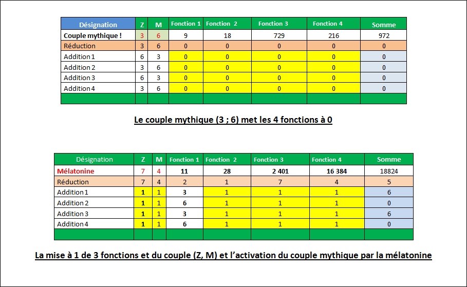 PS: Sans influence de la mélatonine et de l’ADN, le couple mythique (3, 6) met toutes les 4 fonctions à 0. En présence de la mélatonine, de l’ADN et des trois éléments qui génèrent le courant dans le cœur, ce même couple fait monter du plan 4 au plan 7.