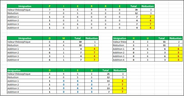Vous comprenez pourquoi beaucoup de personnes s’acharnent à développer leur glande pinéale, afin de profiter, de leur vivant, de cette sorte de fenêtre sur l’au-delà. Certains mots très connus aident à cela. C’est ainsi que certains noms, mots ou sons font aboutir à un cycle de 7-4-7-4 ou de 3-6-3-6 aux quatrièmes étapes de leurs sommes théosophiques. À titre d’exemples, on peut citer: Pierre, Hu, Om, Merci, Dieu etc… qui, prononcés dans la gamme des sons audibles à l’oreille humaine avec la pensée, l’émotion, la parole et l’action voulues, peuvent provoquer des effets insoupçonnables que nous en ayons conscience ou pas. Le mot Pierre est véritablement une clé du plan 7, quand il prononcé par quelqu’un qui en connaît la puissance qu’il soit chrétien ou non ! Ainsi nous sont voilées beaucoup de choses sacrées.
