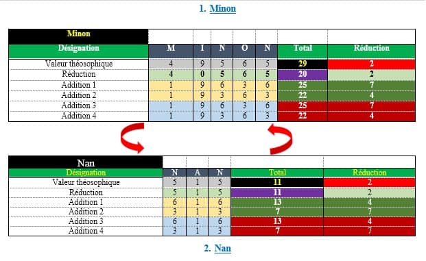 Depuis 1983, le mot le plus extraordinaire que nous avons analysé, le mot générant les mêmes fréquences tant par l’addition théosophique des valeurs secrètes de ses lettres que la constante de partage de rôle dans les mondes physique et métaphysique est MINON-NAN. (voir ci-dessous).