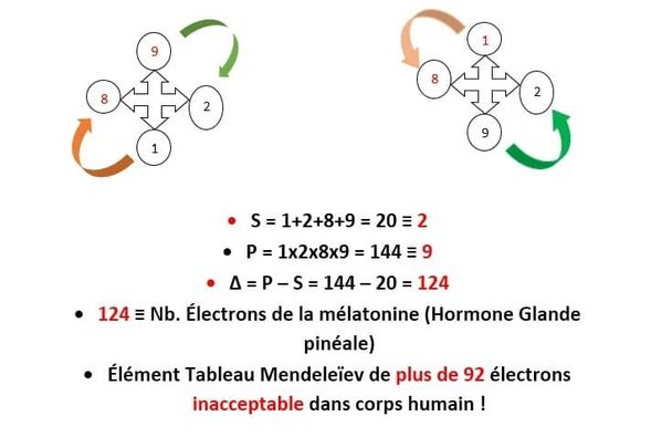 L’écart (∆ = P – S = 144 – 20 = 124) donne EXACTEMENT le nombre d’électrons que possède la Mélatonine, cette hormone de la glande pinéale qui est une fenêtre sur le monde « invisible » ! Remarquons aussi que la Vitamine D3 que notre corps peut fabriquer à partir des rayonnements ultraviolets possède 214 électrons, simple inversion des places de 1et 2. Autrement dit 124 et 214 réduits donnent tous 7. Seulement que 124 se plie à la domination de 214. AINSI OPÈRE LA LOI.